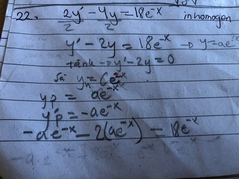 jag förstår inte hur jag ska lösa a för jag testade men det blev bara att a =-6 och sedan förstår jag att man ska addera den homogena funktionen med den partikulära funktionen dvs yh+yp svaret ska bli: y = Ce^(2x)- 3e^(−x)