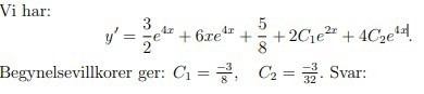 Eller förresten: utgå från att y′′ − 6y′ + 8y = 3e4x + 5x för att ta reda på vad y(x) är för något. Jag antar att detta har gjorts och att y' fåtts fram genom att derivera den då uppkomna funktionen.