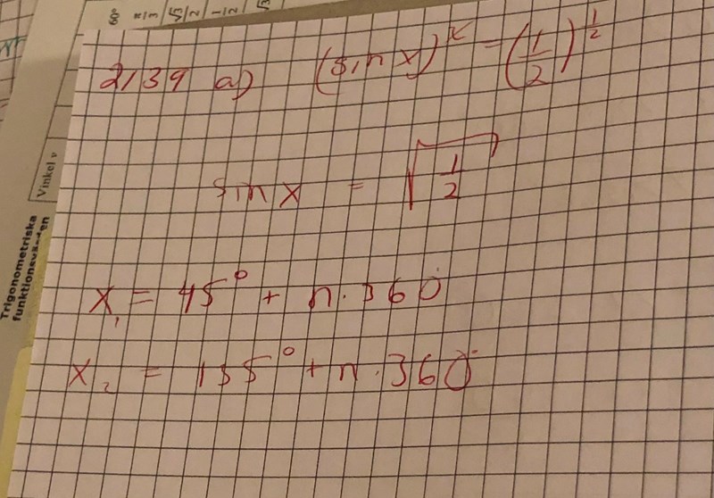Du glömmer att ekvationen (sin(x))2 =1/2 även har lösningen sin(x) = -