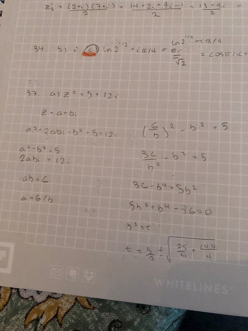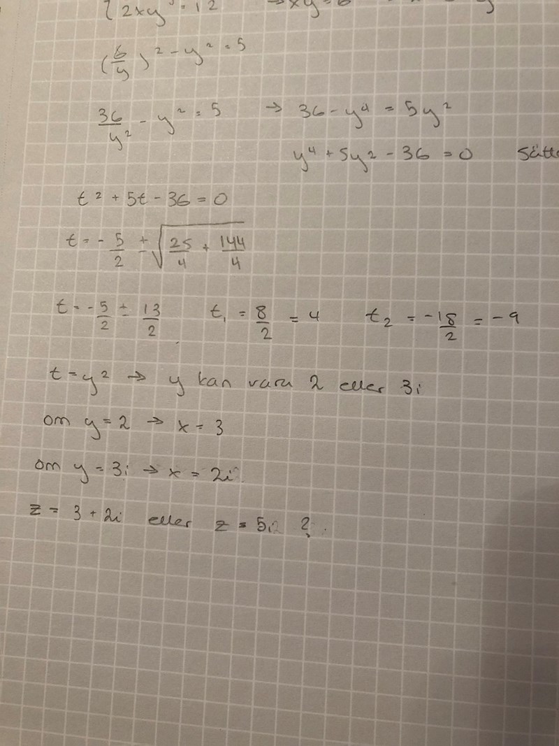 Hejsan, jag ska lösa z^2=5+12i men gör något fel på vägen. Tänkte att man kunde ställa upp två ekvationer, en för realdelen och en för den imaginära delen men får fel :(. Ser någon vad jag gör fel?