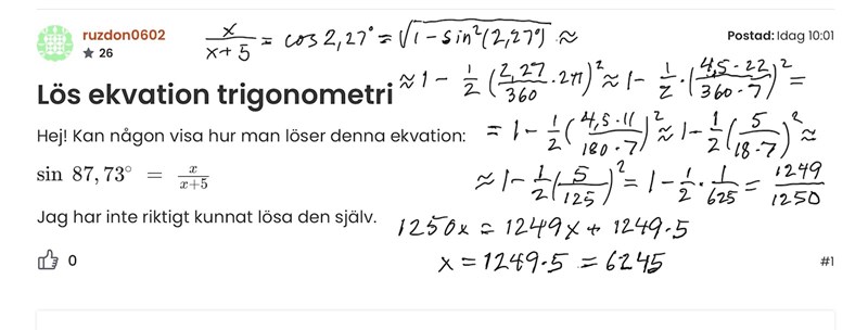 Om du skall ha ett exakt värde på x så får du inte göra det. Då får du lösa för x utan att beräkna sin för vinkeln. Byt ut sin(87,75) mot ett q en stund om det blir enklare. Byt sedan tillbaka när du nått x=….