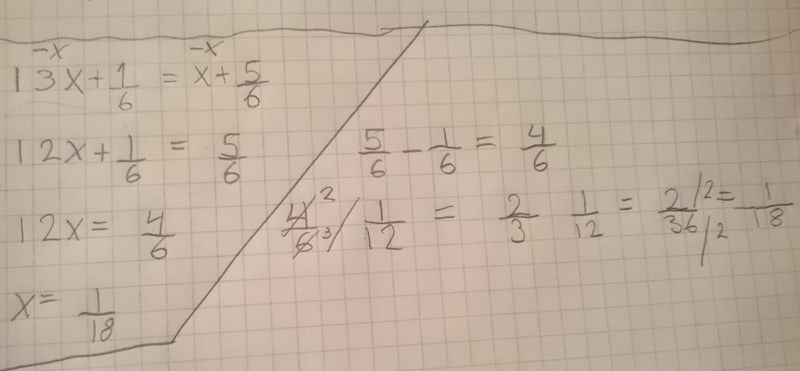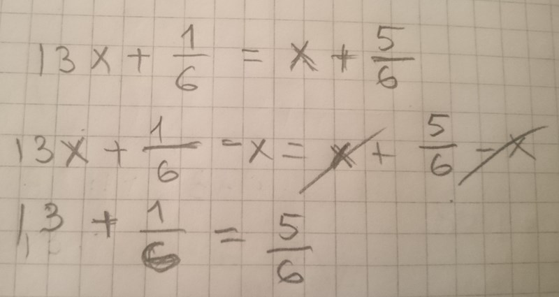 13x+16=x+5613x+\frac{1}{6} = x+\frac{5}{6}