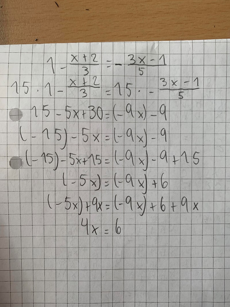 Hej, kan någon hjälpa mig med den här? Jag försökte multiplicera allt med 15 eftersom det är 3 o 5 minsta gemensamma nämnare. Men längre har jag inte kommit.