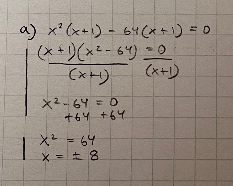 Jag har löst denna uppgift som du kan se nedan. Jag har delvis kommit fram till rätt svar vilket är att x1 = 8 och x2 = -8, men i facit står det sedan att x även är -1. Vart får dem det ifrån? Vad är det jag har missat som gör att jag inte kommer fram till det?