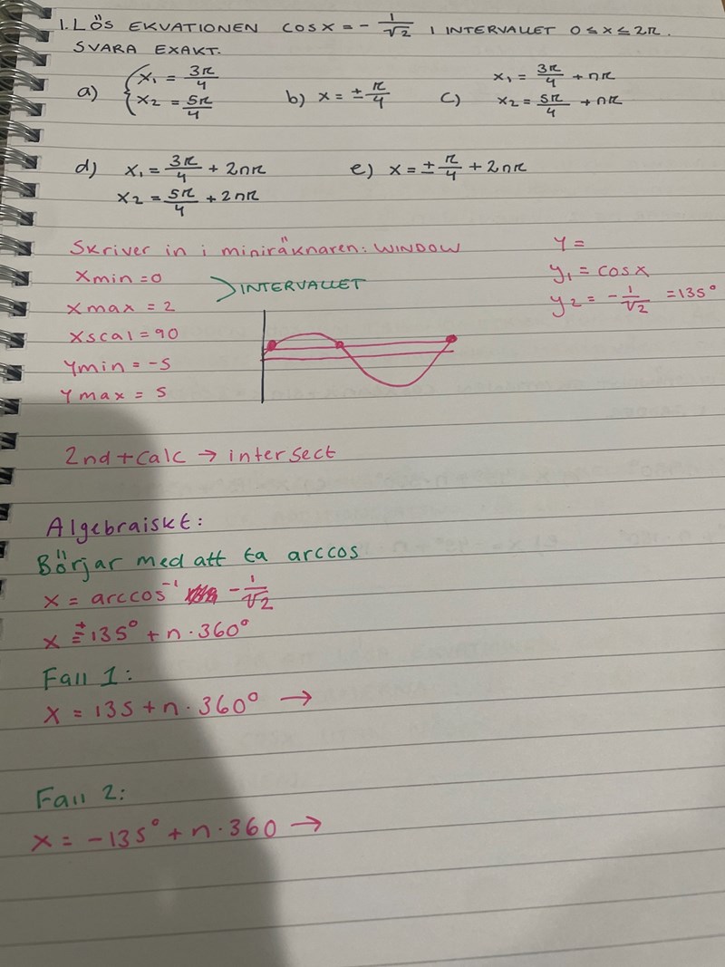 Lös ekvationen cosx= -(1/roten ur 2) i intervallet 0<_ x <_ 2 pi