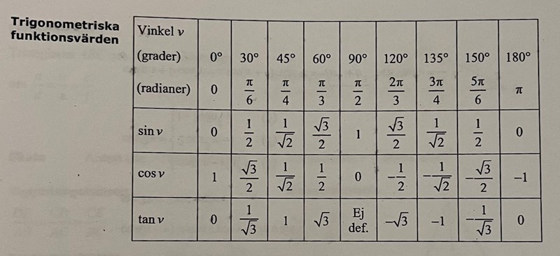 M.h.a tabellen på de trigonometriska funktionsvärdena.