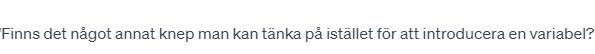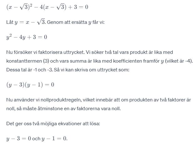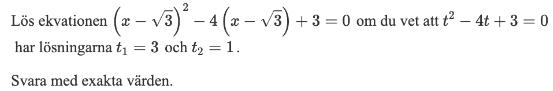 Uppgiften serverar dig två färdiga lösningar till ekvationen t2-4t+3 = 0. =m du inser att ekvationen i uppgiften är nästan likadan ser du att vi har två möjligheter, att x-3=3eller att x-3=1, så det är väldigt lätt att hitta de båda värdena på x. För säkerhets skull, kolla att du inte har fått med några falska rötter!