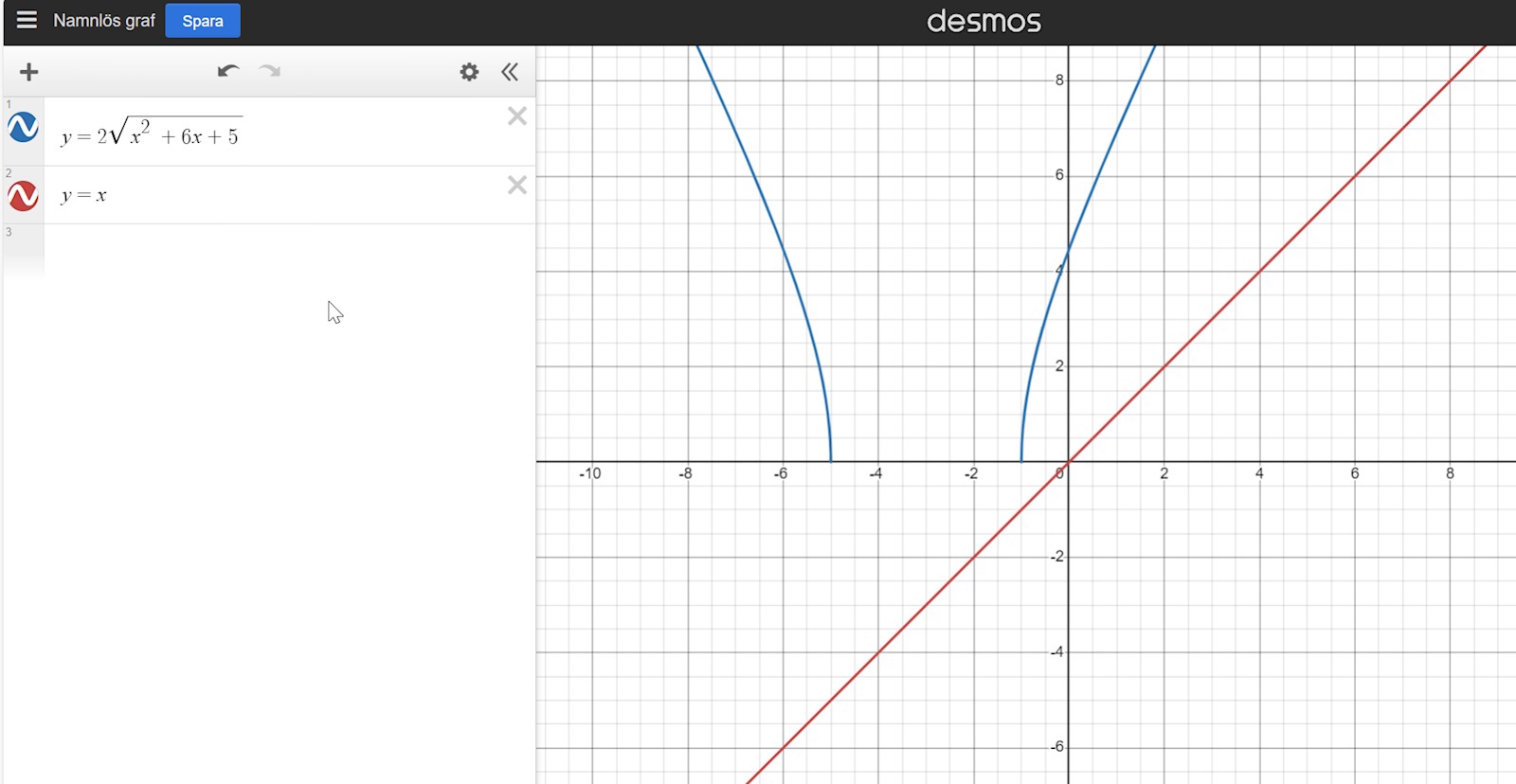Jag skulle nog flacka lite med blicken om man bad mig rita den blå kurvan helt utan hjälpmedel, alltså även utan miniräknare. Ett par nollställen kan jag nog hitta, särskilt om jag ser att uttrycket under rottecknet är (x + 5) (x + 1). Därefter kan jag kanske inse att den sticker uppåt, åt olika håll.