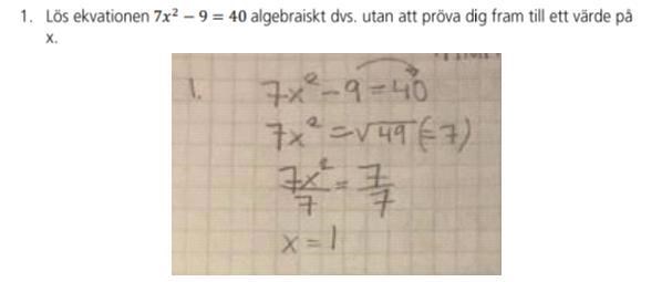 Lös ekvationen 7x^2 - 9 = 40 algebraiskt