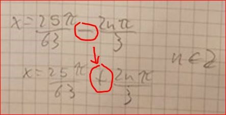 Jag får svaret x=11π/63+2πn/3,25π/63+2πn/3, men det är fel. Någon som vet hur man löser den här uppgiften?