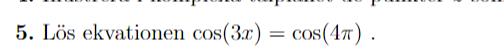 jag fick fram att cos(3x) är samma som cos(2pi) vilket är 1, så 3x är 0 + 2pi*n och x är (2/3)pi*n, men facit säger att det är (2/7)pi*n. Hur fick de nämnaren till 7?