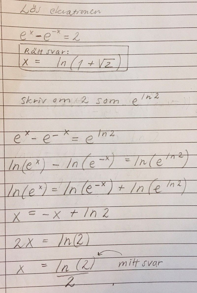 Jag har löst ekvationen och fått samma värde som det korrekta svaret, men hur gör jag för att komma fram till x=ln(1+sqrt(2)) ?