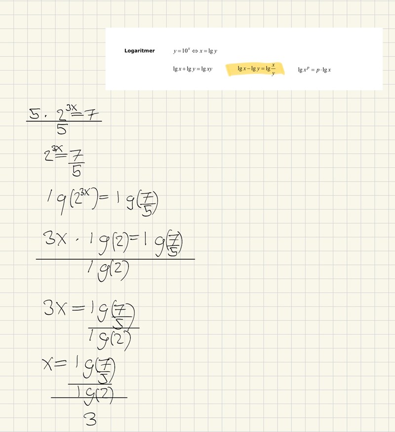 [ lg(7/5) / lg(2)] / 3 = lg(7/5) / [ 3·lg(2)]