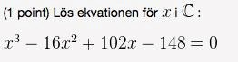 Har försökt att sätta in x = ±1 , ±2 , ±3 osv för att hitta en rot till denna utan att lyckas och har inte heller kommit på ett annat sätt att skriva om den. Har någon ett tips?