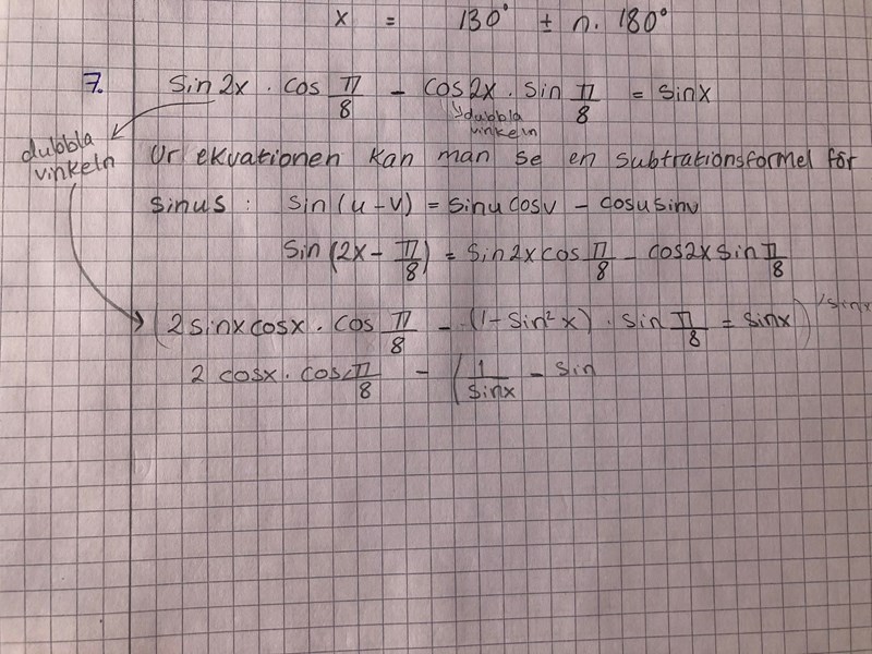 Lös fullständigt ekvationen sin2x*cosπ/8 - cos2x*sinπ/8 = sinx. svara exakt.
