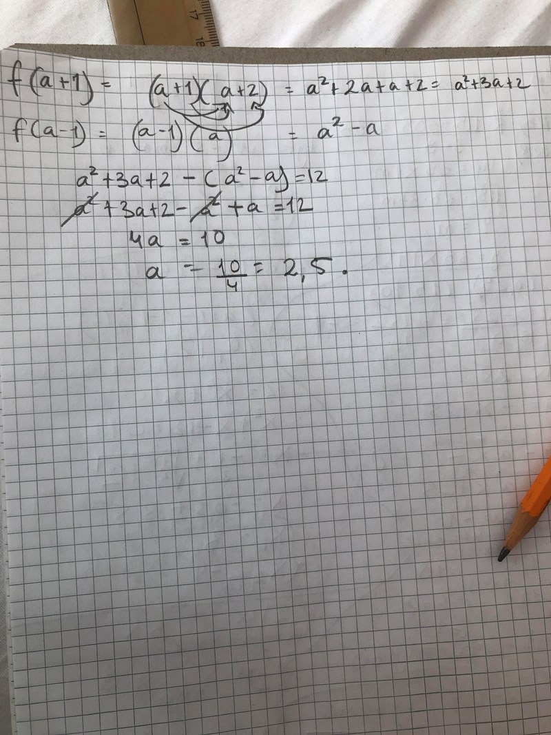 Lös ekvationen f (a+1) - f (a-1) = 12 där f (x) = x(x+1)
