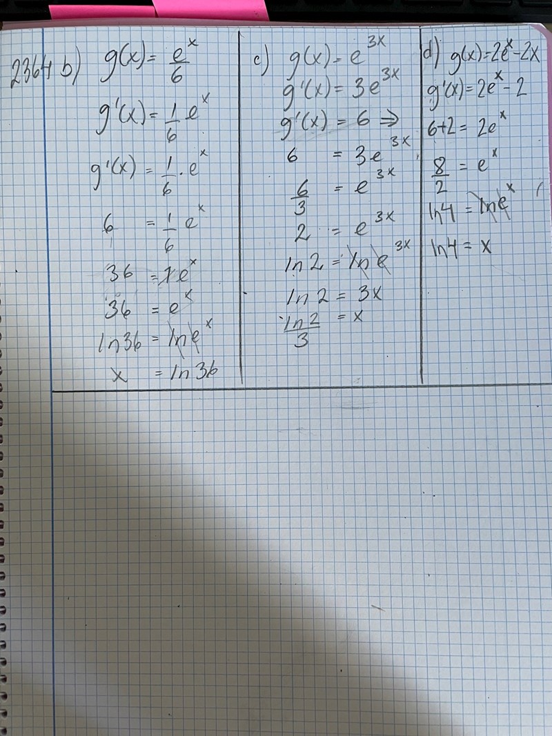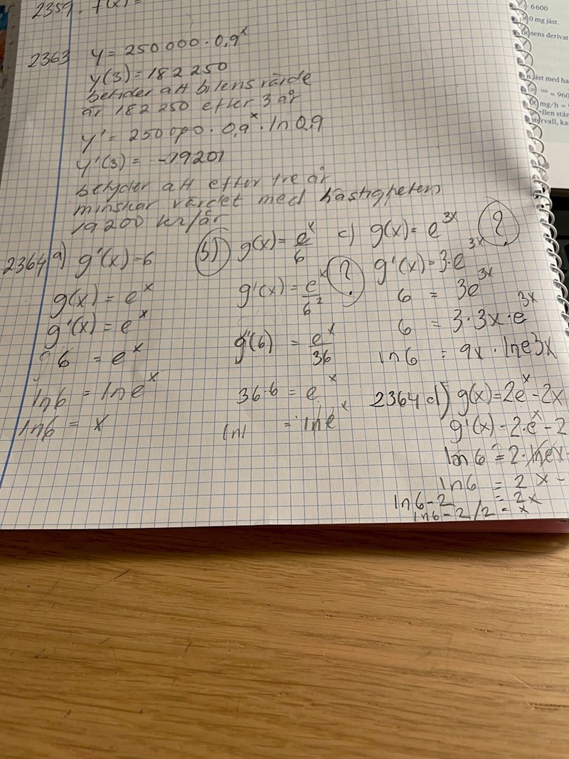På d) förstår jag inte heller riktigt (svårt att se på bilden) men det verkar som att du inte har logaritmerat HELA högerledet, bara en term. Det borde bli ln6=ln(2ex-2).
