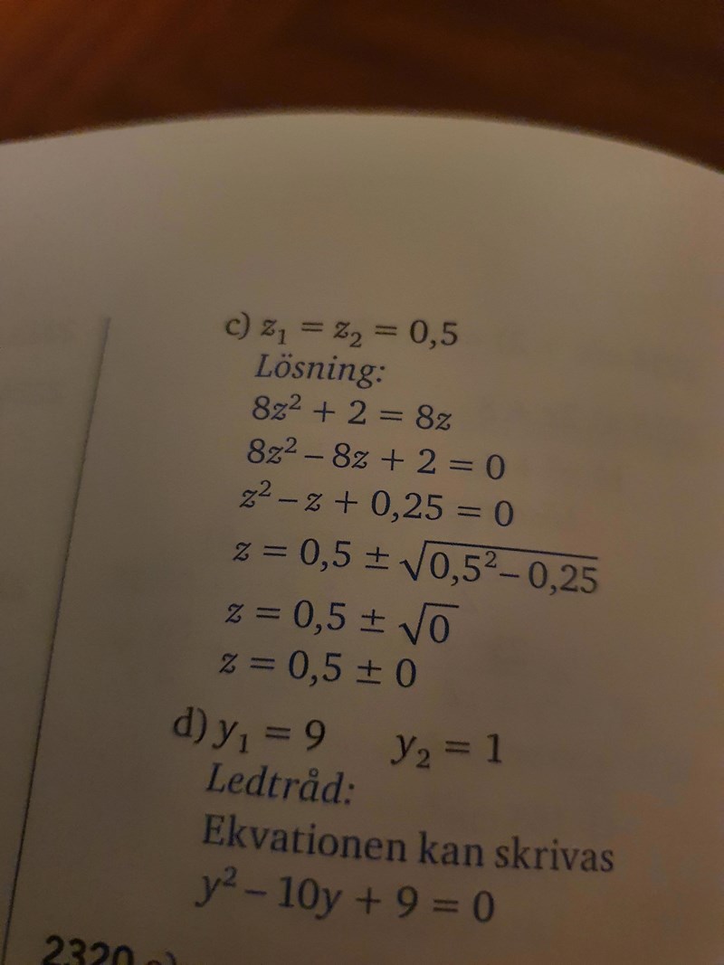 Har fastnat i en uppgift i matte 2a där man ska lösa ekvationen med lösningsformeln. Bifogar en skärmdump från facit eftersom jag försökte förstå varför jag inte kunde lösa den. Men var kommer 0,5 från? Jag kom fram till delen precis ovan men kan inte förstå vart -z tar vägen och var 0,5 kommer ifrån. Samma typ av problem stötte jag på d), ja kan inte lösa den. Vad är det jag missar? Hjälp någon?