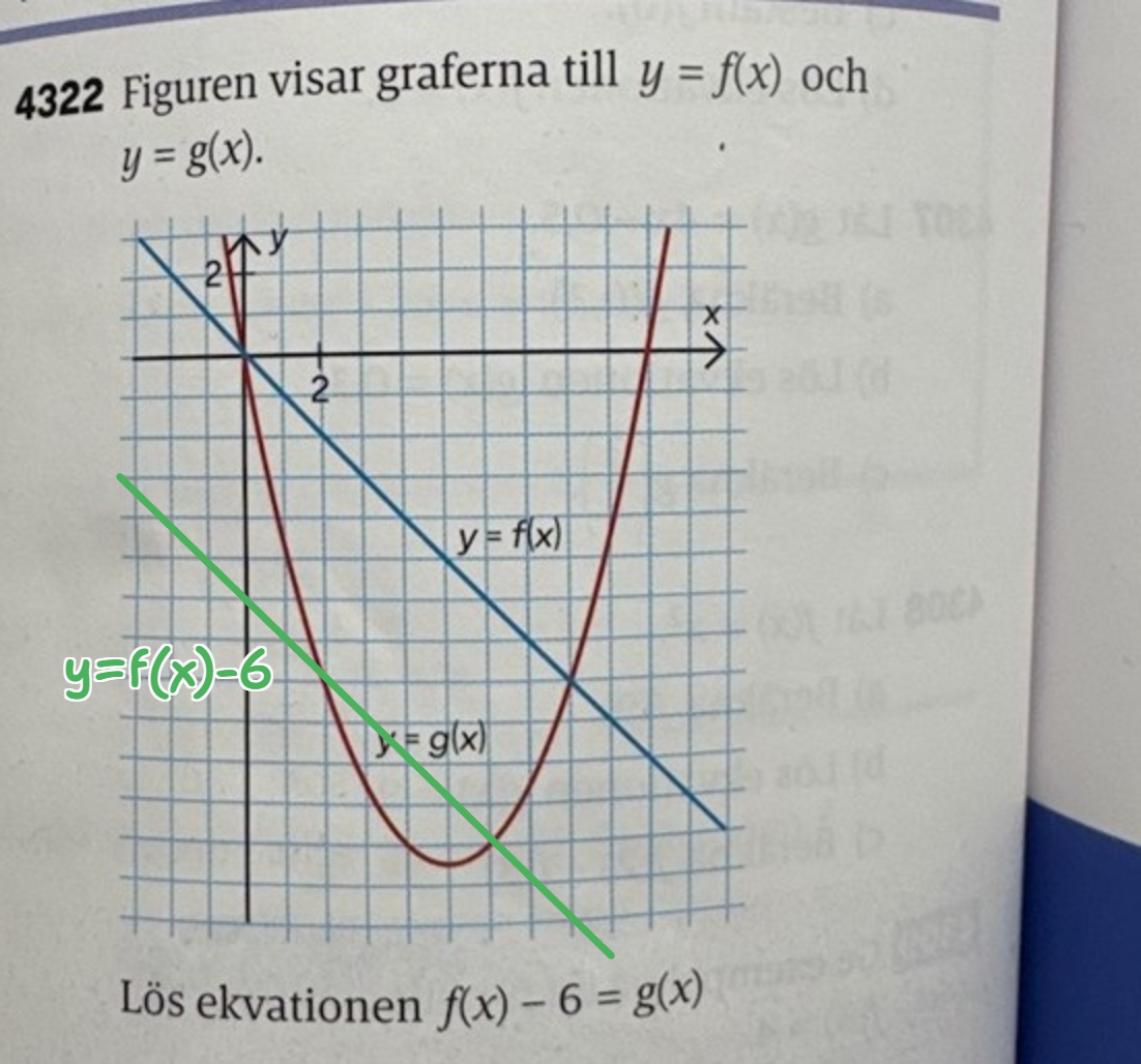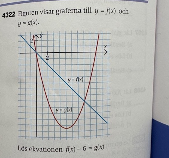 ska man komma på ekvationer för de två graferna och sätta in dem i ekvationen, eller borde man bara kolla i koordinatsystemet och se för vilket y-värde på grafen f som ger y-värdet för g?