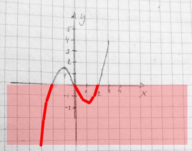 Och det är det du ä rute efter, eller hur? De x-värden som ger negativa y-värden är dels de x-värden som är mindre än -2, dels de som ligger mellan 0 och 2, alltså x < -2 eller 0 < x < 2.