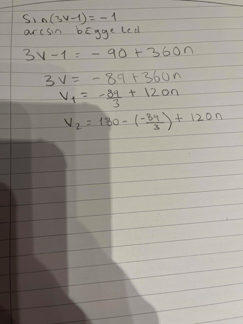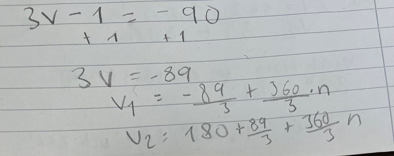 Det betyder att ekvationen har lösningarna 3v - 1 = -90° + n•360°.