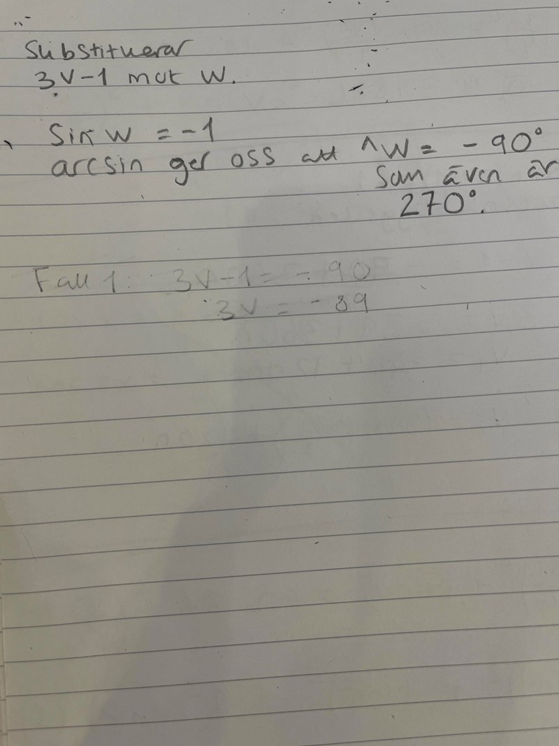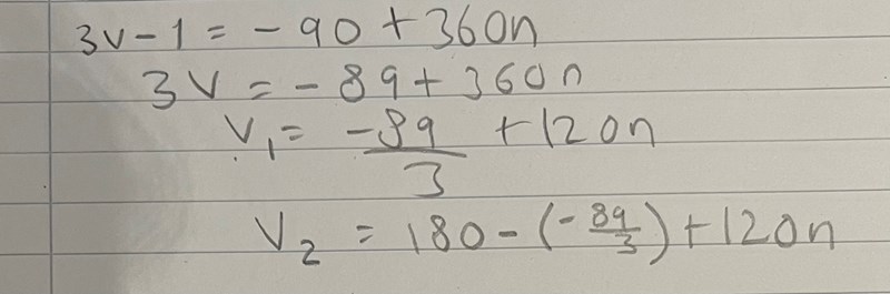 - Eftersom vi hade 3v - 1 = w så gäller det att 3v - 1 = 270° + n•360°.