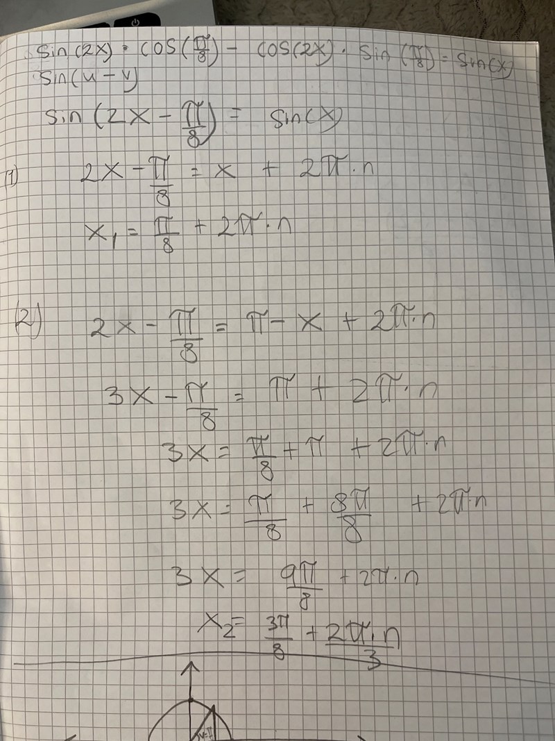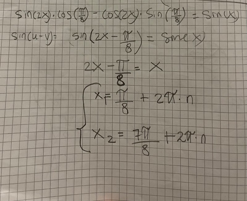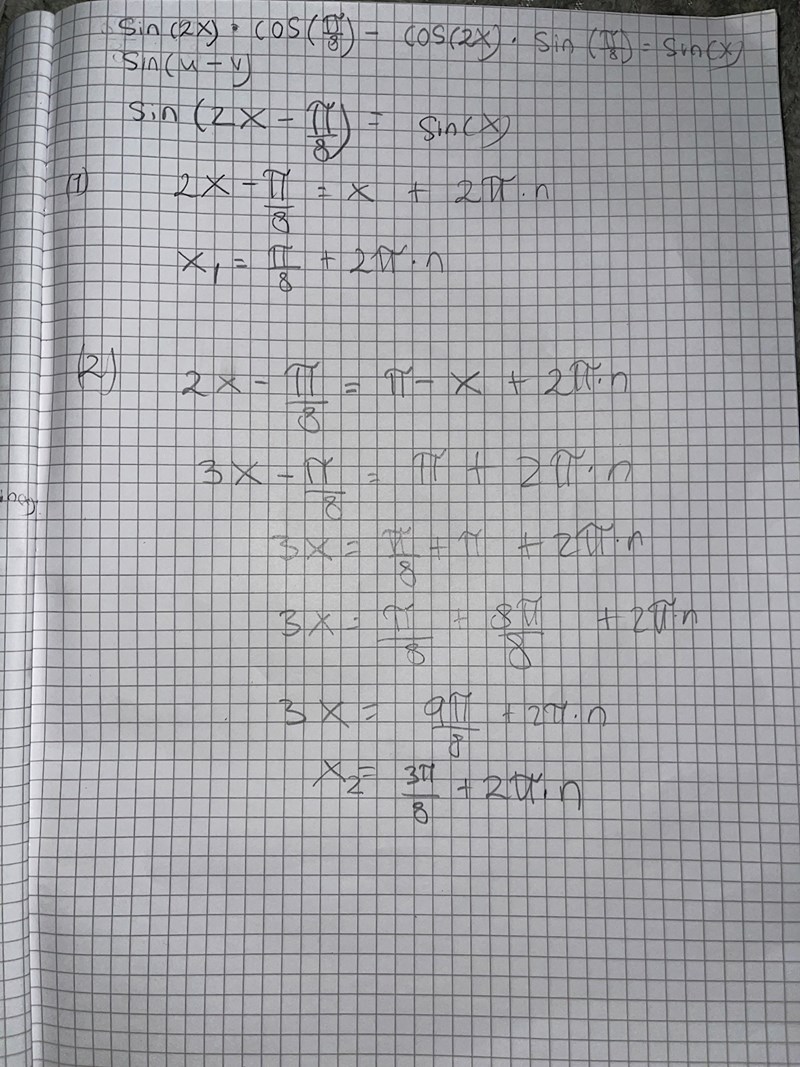 Lös fullständigt ekvationen sin2x*cosπ/8 - cos2x*sinπ/8 = sinx. svara exakt.