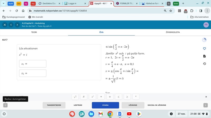 Lös ekvationen x^2=i