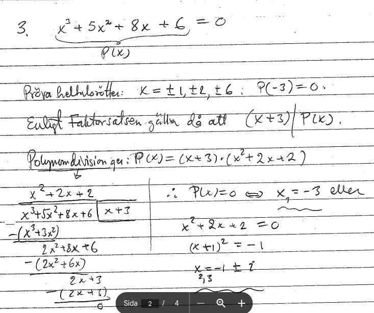 vilka av dem nedan är det rätt då nedan du var otydligt när skrev din lösning är rätt menar du att den är fel > (x+3)*(x+1)*(x+1) = x^3+5x^2+7x+3, att det är istället den är >(x+3)(x+1-i)(x+1+i) = x^3+5x^2+8x+6