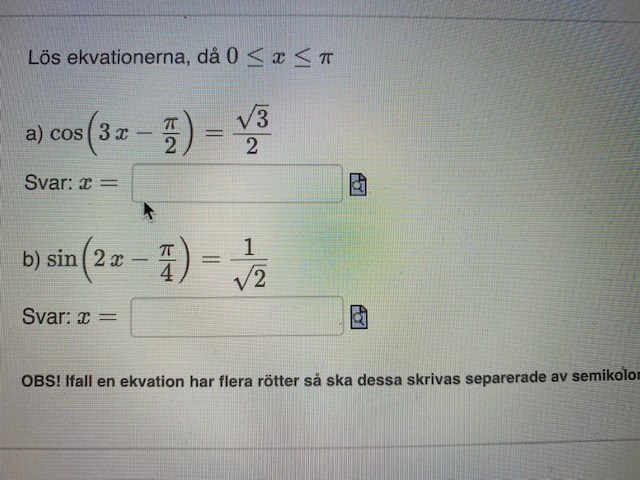 1. Ekvationen är cos(3x-π2)=32\cos(3x-\frac{\pi}{2})=\frac{\sqrt{3}}{2}