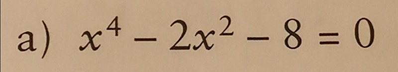 Då är t2=x4t^2=x^4 och ekvationen kan skrivas t2-2t-8=0t^2-2t-8=0.