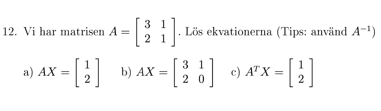 På a) så har jag börjat med att sälla om ekvationen så att den blir är det rätt? Ska jag sen börja med att räkna ut vad A-1 är för att kunna lösa ekvationen?