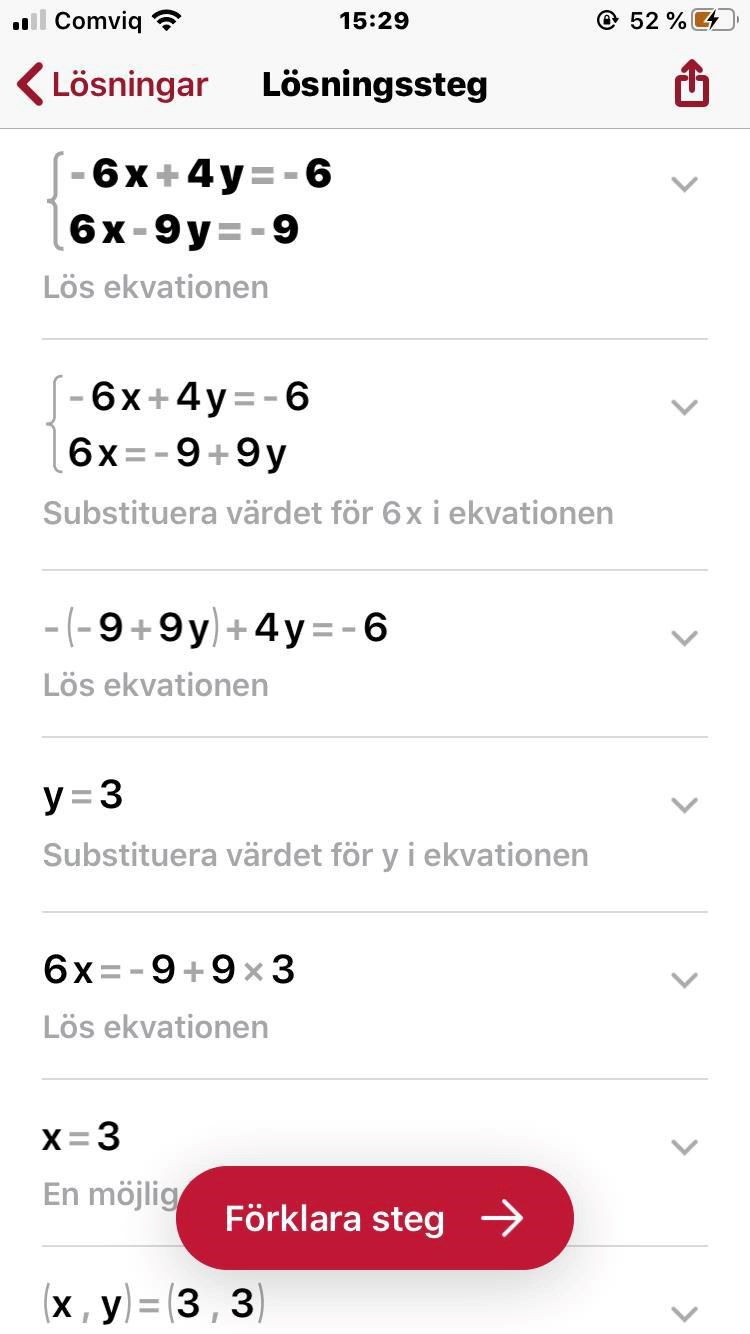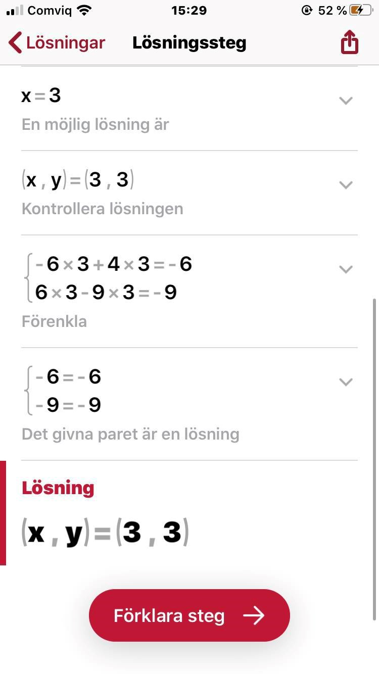 Kontrollera ditt svar genom att sätta in dina framräknade x och y i den andra ekvationen. Stämmer det?