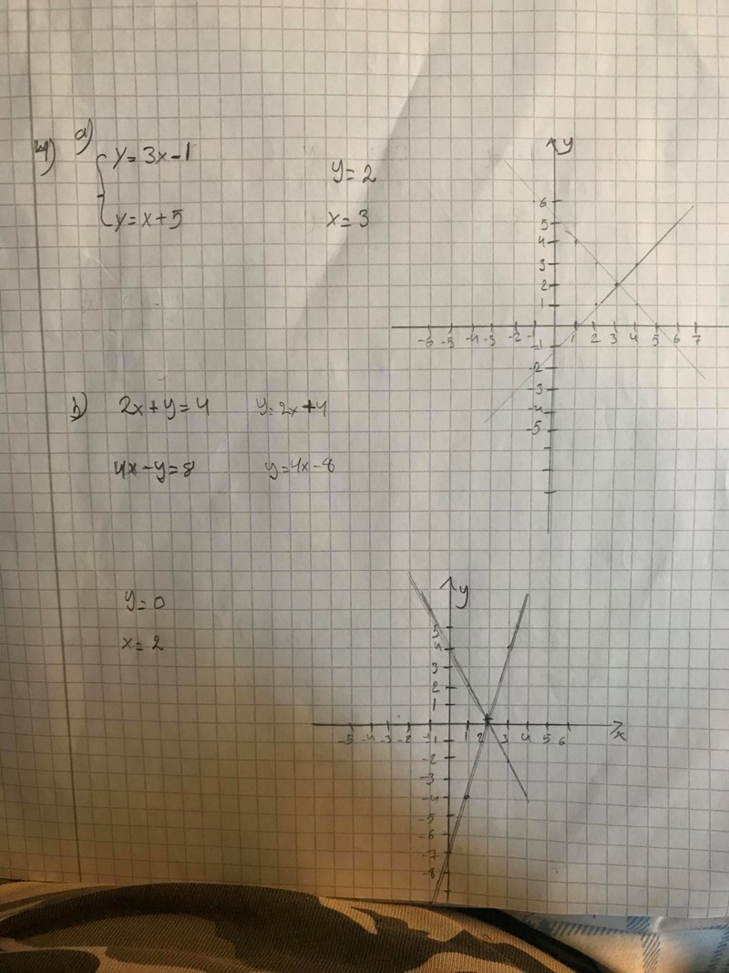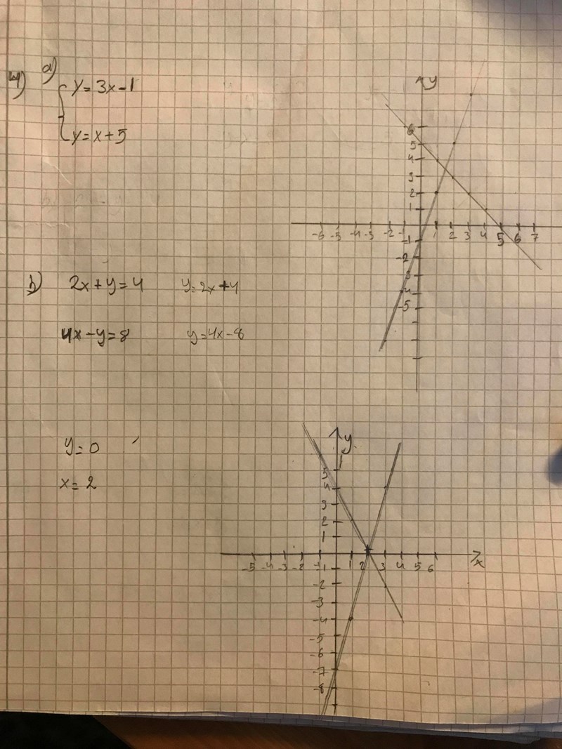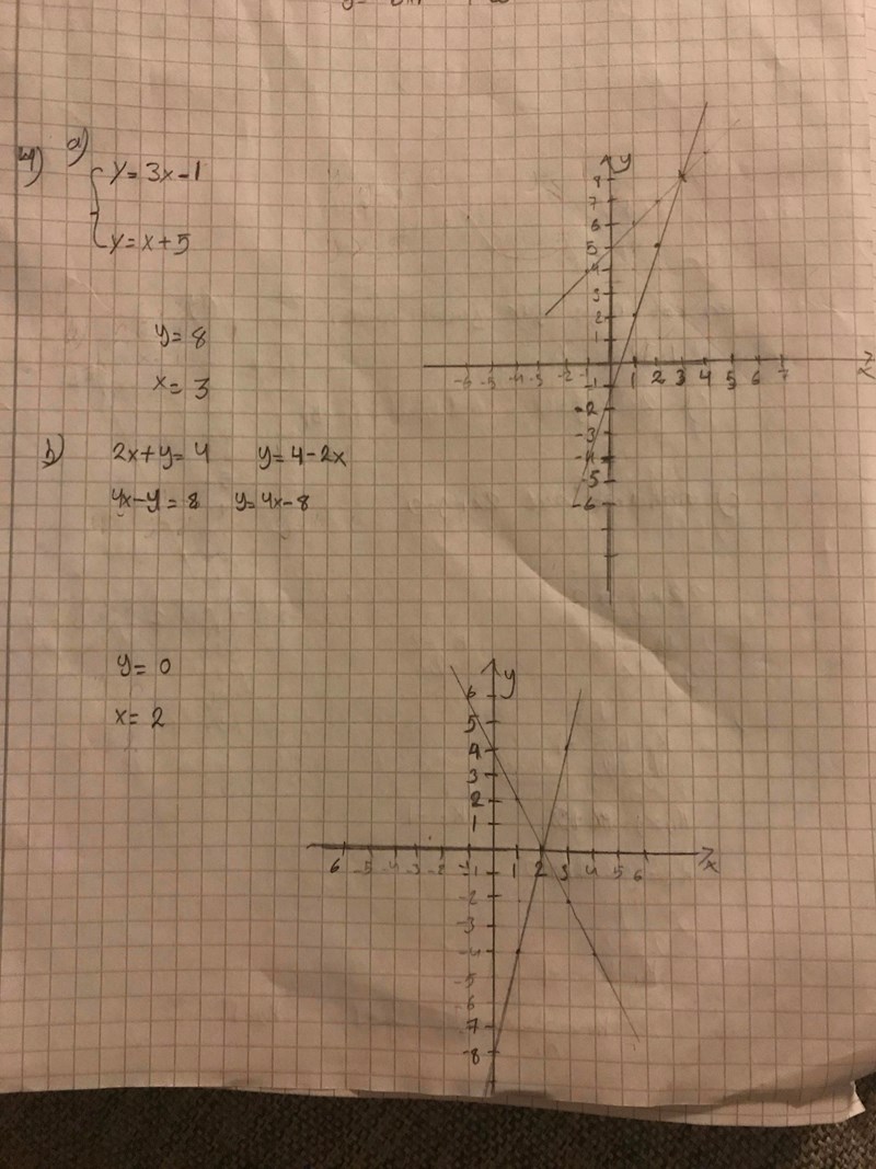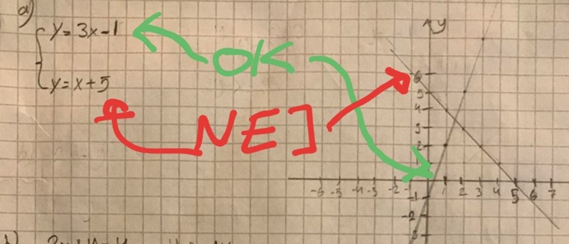 Du har ritat linjen y = 3x - 1 korrekt men den andra linjen du har ritat motsvarar ekvationen y = 5 - x, inte y = x + 5.
