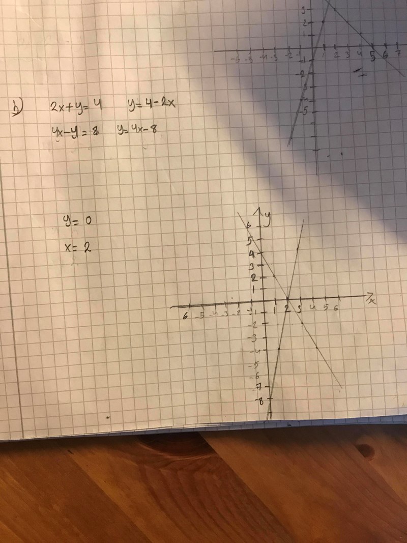 Den andra ekvationen y=4x-8 är inte vad du ritat i din figur. Om x=0 så blir ju y=-8 (din figur verkar vara med y=-7)