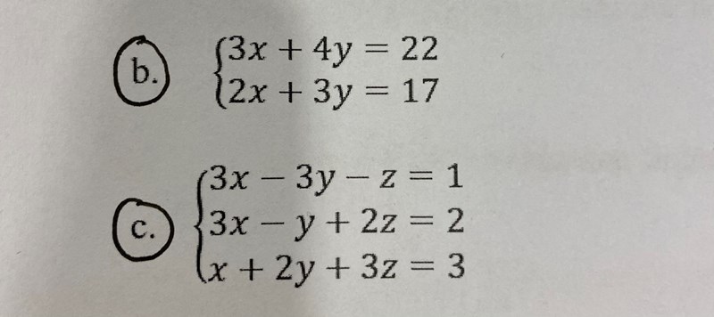 I c.-uppgiften borde man kunna eliminera x:en i rad I och rad II genom att subtrahera båda med rad III tre gånger. Detta kommer göra att de två då uppkomna ekvationerna endast innehåller två okända variabler y och z, och då kan man titta kring lite grann på samma sätt som i b.-uppgiften.