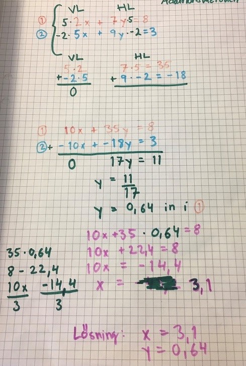 migge83 skrev:Jonto skrev:På ditt första försök så är felet att du måste multiplicera hela ekvationerna med det som du multiplicerar med, alltså även det som står på andra sidan likhetstecknet. Minns du att ekvationer är som en vågskål som man måste hålla samma balans i? Om du bara multiplicerar med 5 respektive -2 i ena vågskålen(ena sidan i ekvationen) och inte andra så förändrar du ekvationen om jämvikten.