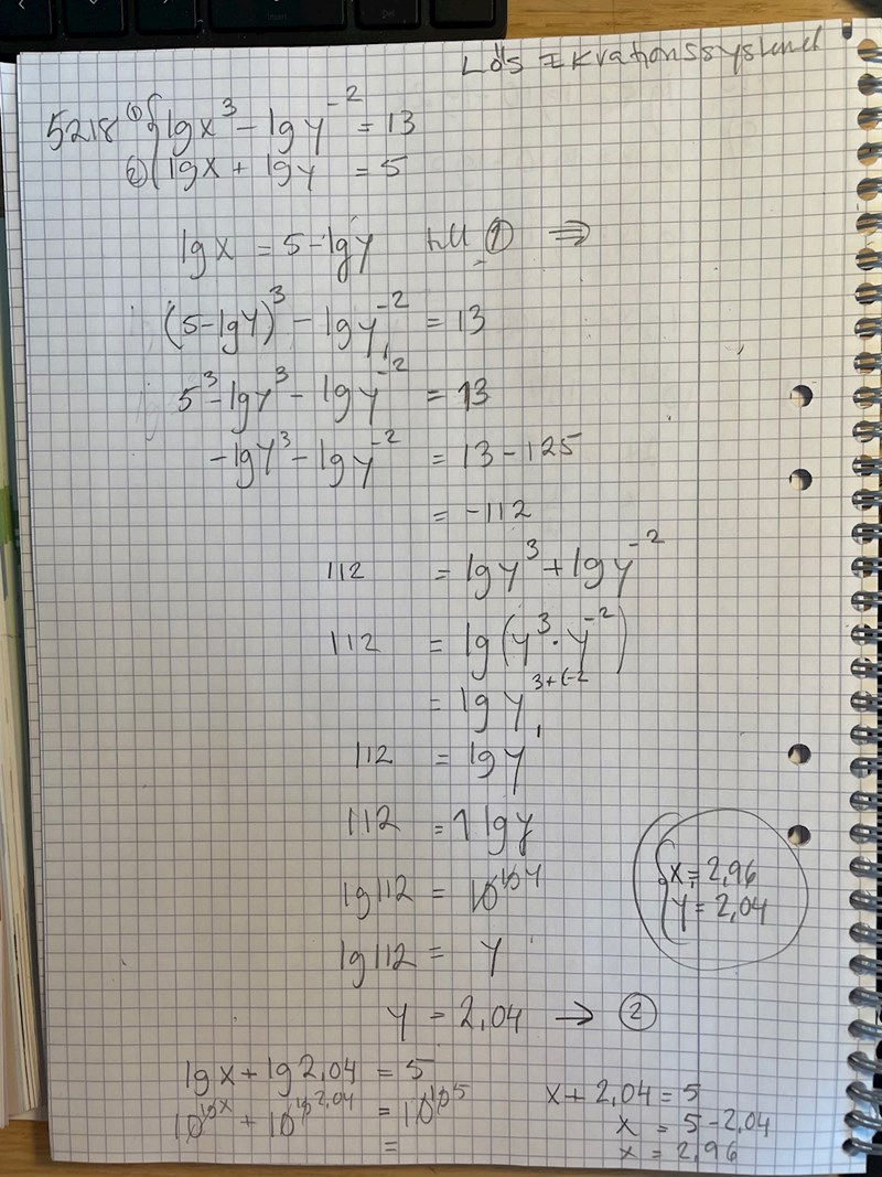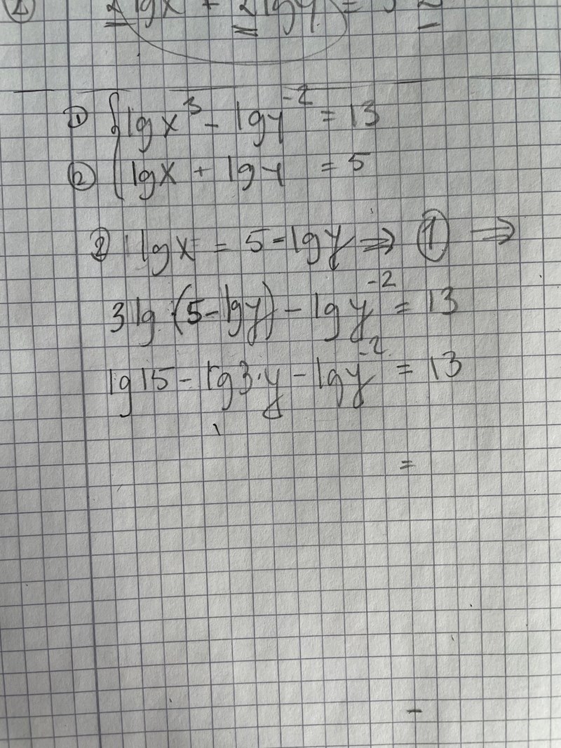 lg(x3)-lg(y-2) = 13, dvs 3•lg(x)-lg(y-2) = 13
