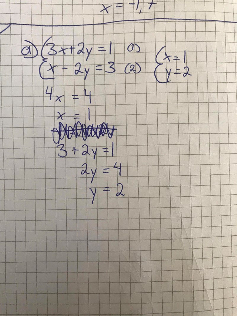 Rätta svaret är x=1 och y=-1 men jag kan inte få 3*1+2y=1 till att y ska bli lika med -1 utan jag får det till att y är lika med 2. Hur får jag det till -1?