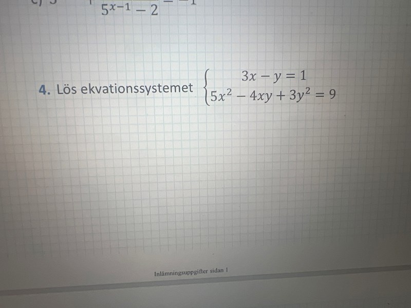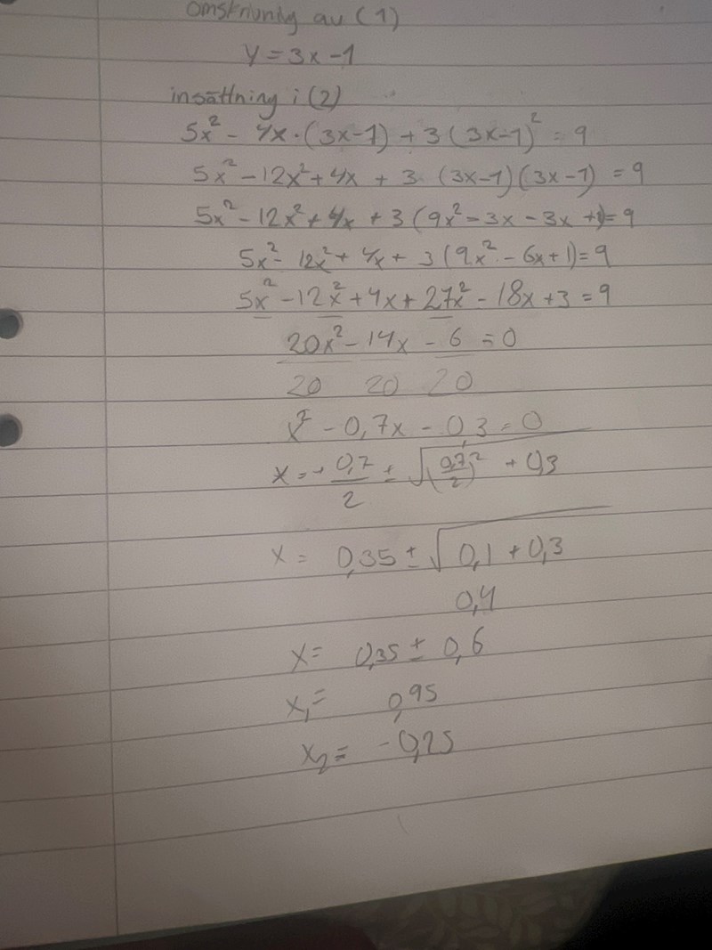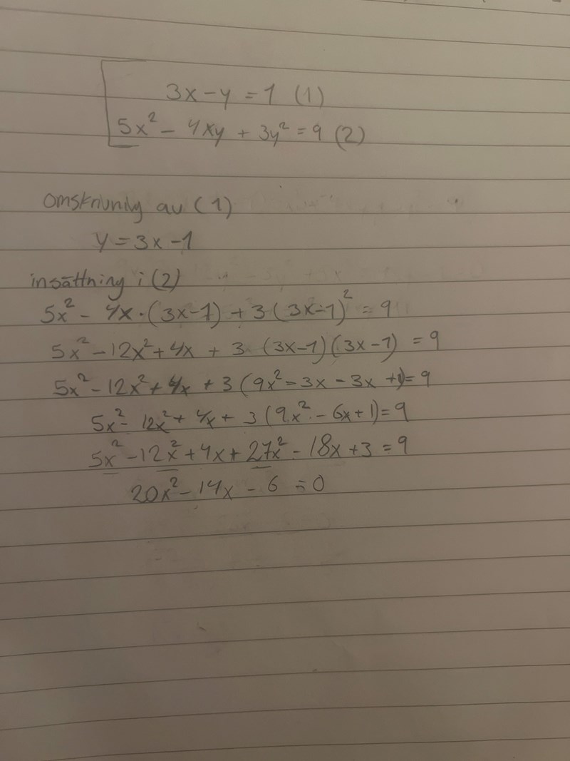 jag har fått fråga där jag ska lösa den här ekvationssystemet. Jag vet sen tidigare från matte2 att man kan lösa det med substitutionsmetoden och det har jag försökt att lösa.