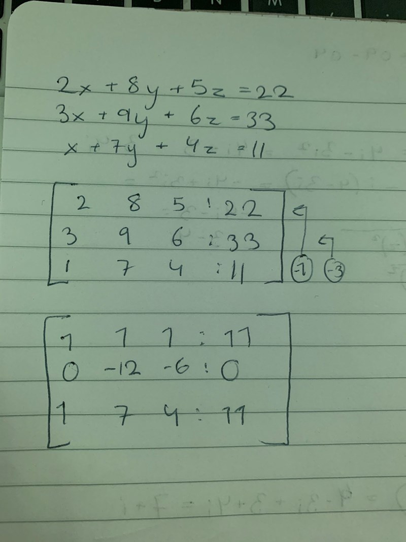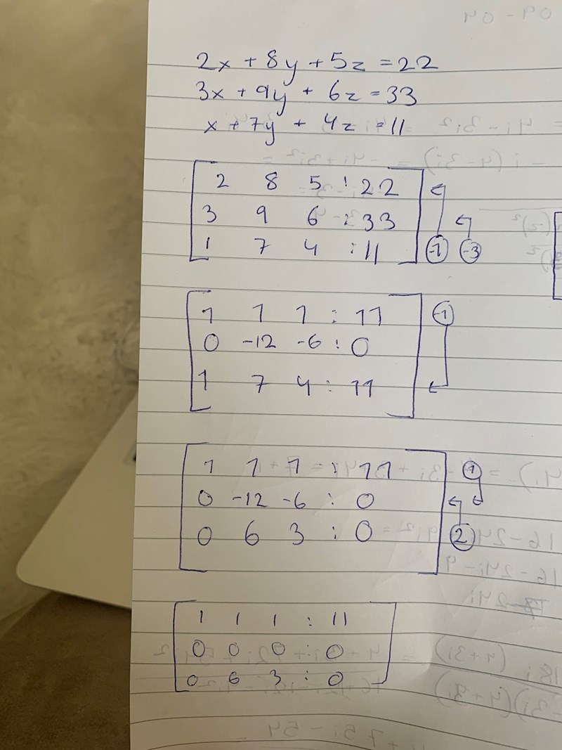 3) Det är uppenbart från början att de här 3 ekvationerna inte är oberoende. Så du bör få en lösning med en parameter.