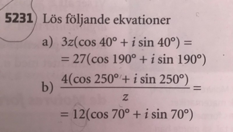detrr skrev:Hej, jag blir väldigt förvirrad när det kommer till uppgifter som säger lös ekvationer som t ex denna. Jag har löst den och valt att svara i polär form. På a) har facit också gjort det, men på b) har de svarat i rektangulär form (a + bi). Hur ska man veta på vilket sätt man ska svara på om det inte nämns i uppgiften?