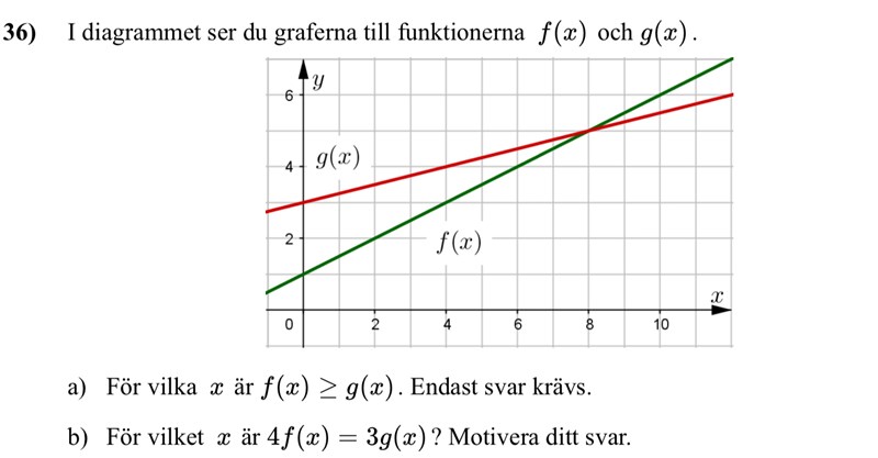 Igen fick jag ingen notis att ni svarade, men förstår fortfarande inte vad ni menar. Jag har skrivit ned båda linjerna som y = kx + m, men ser inget uppenbart ifrån dem. Ska 4 av f(x) vara 3 g(x) ekvationer? Hur ställer du upp dem som f(x)=3/4g(x)?