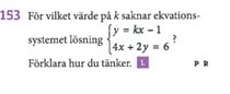 Jahaaa, vänta nu, jag läste frågan igen. De frågade aldrig efter en lösning. De ville bara veta vilket k-värde som gjorde att det inte gick att lösa ekvationssystemet- Alltså -2x för då är lutningarna den samma och graferna är parallella . De kommer aldrig korsa varandra någonstans! Nu trillade poletten ner. Tack för hjälpen!