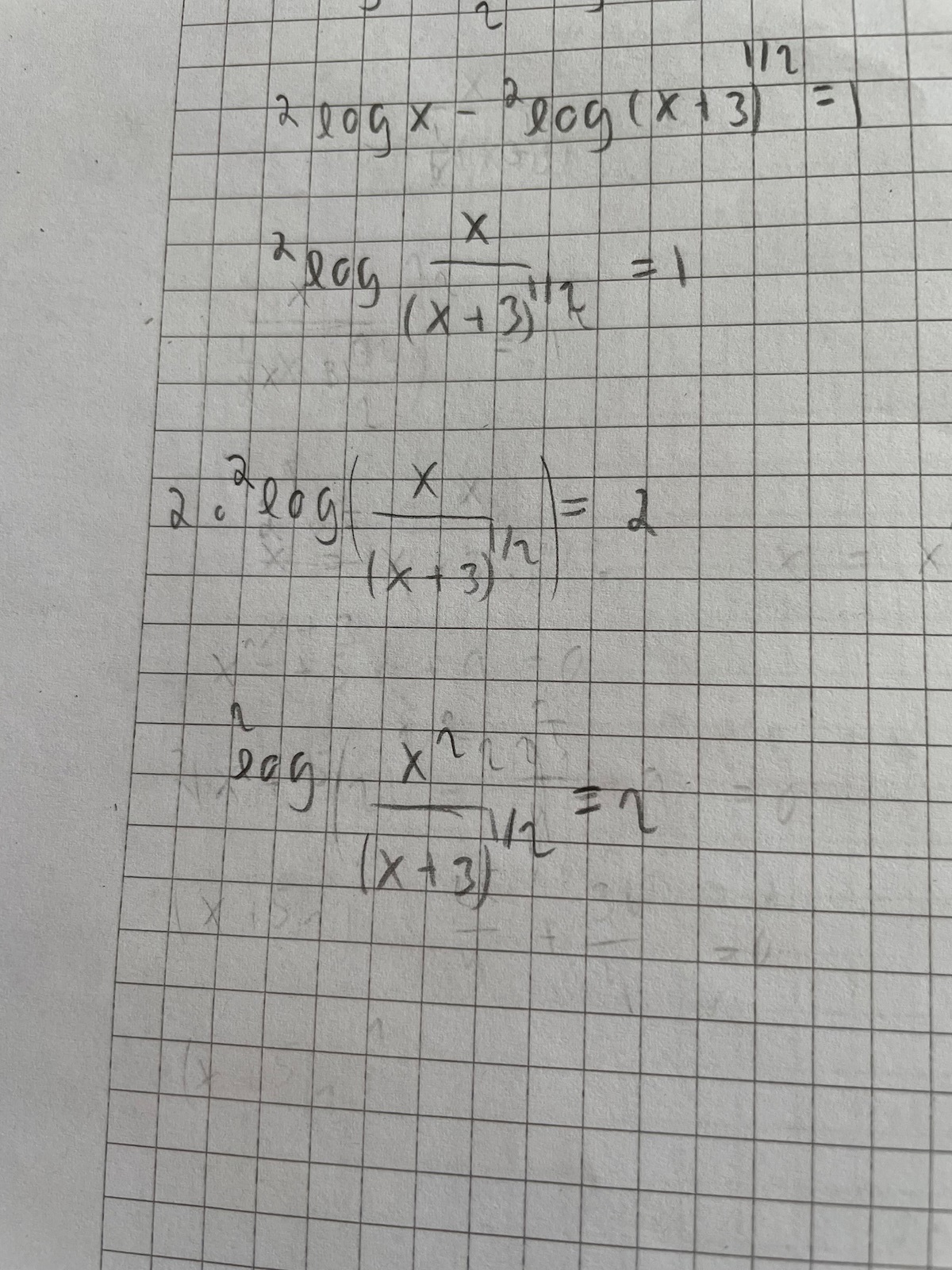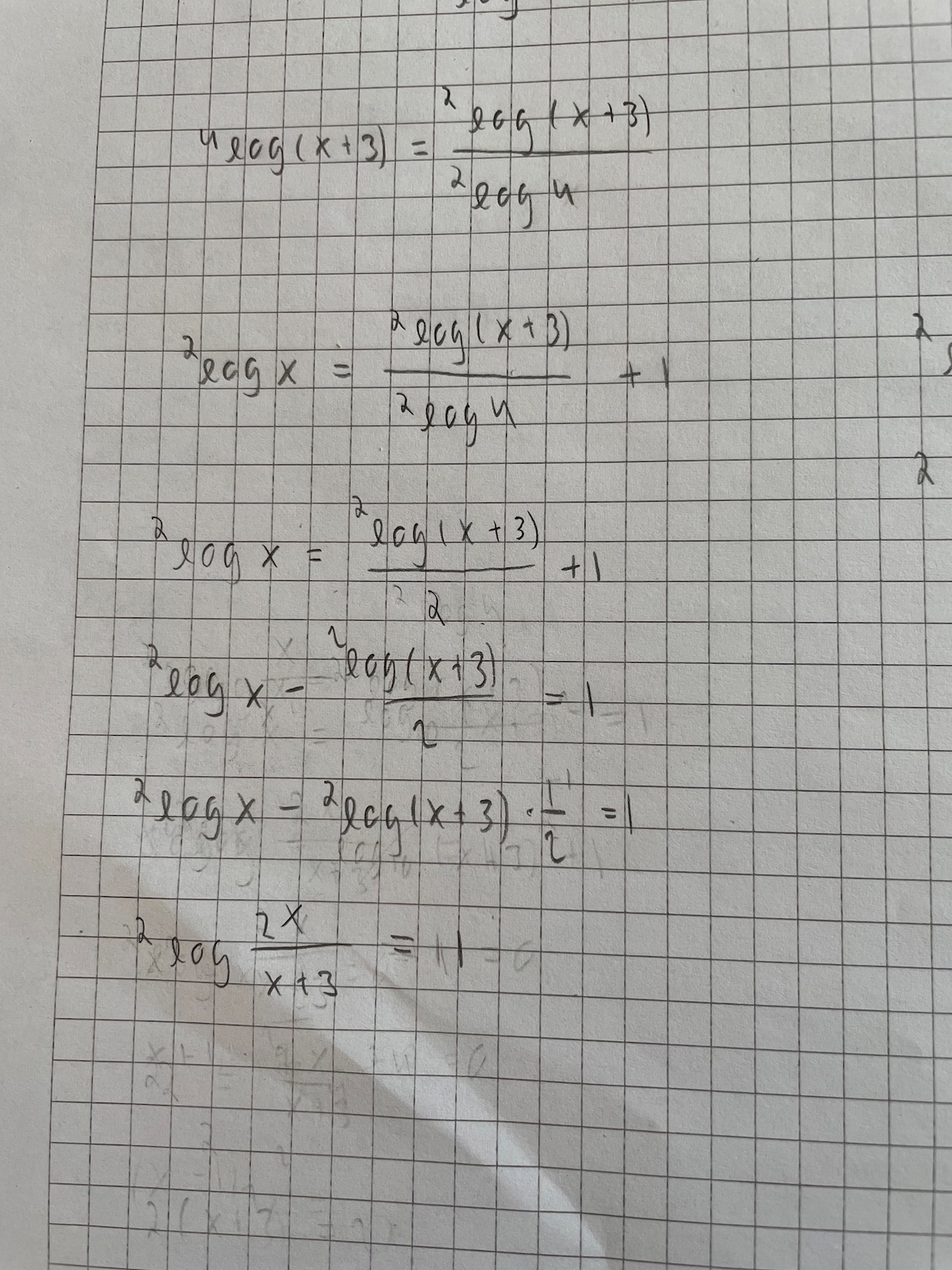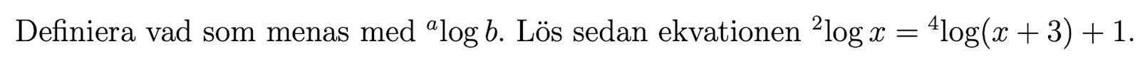 Jag testade med basbyte för att lösa ekvationen men jag vet inte hur jag ska gå vidare eller om jag är på rätt väg. Testade uttrycka 2logx i 4log(x+3) vice versa. Vet ju att det finns räknelagar men vet inte hur de är relevanta.
