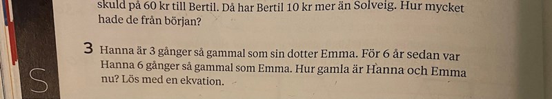 Försök nu att skriva "För 6 år sedan var Hanna 6 gånger så gammal som Emma" som en annan ekvation.