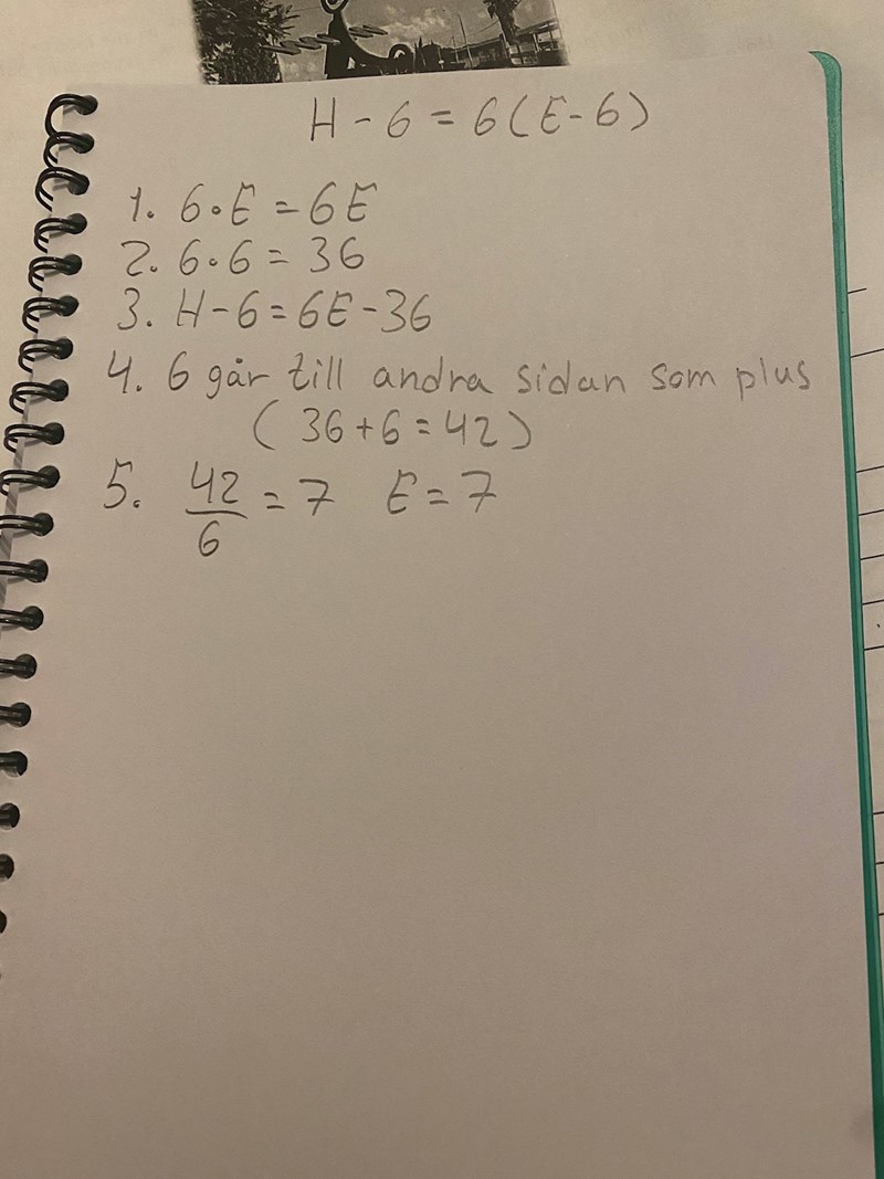 Detta tal ska vara 6 gånger så stort som Emmas ålder för 6 år sedan, dvs 6 gånger så stort som E-6, dvs 6•(E-6).