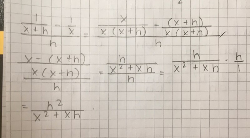 Jag kan ju liksom inte stryka bort h som det ser ut i nuläget och jag vet ju liksom att talet det bör bli 1/x^2 så h^2 och xh förstör ju liksom!