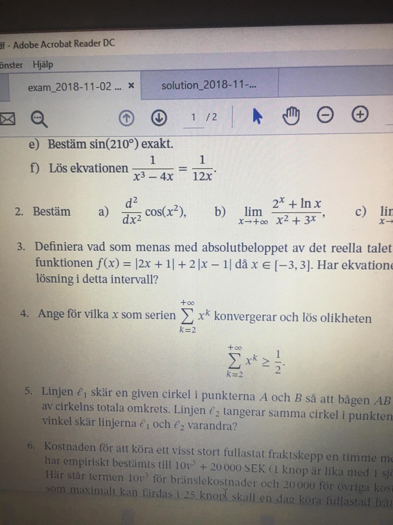 är på 4. Vet att den är konvergent då absolutbeloppet av x är mindre än 1. Men lyckas inte lösa olikheten. I facit står det att för de värdena på x är summan lika med x^2/(1-x). Förstår inte varför :(