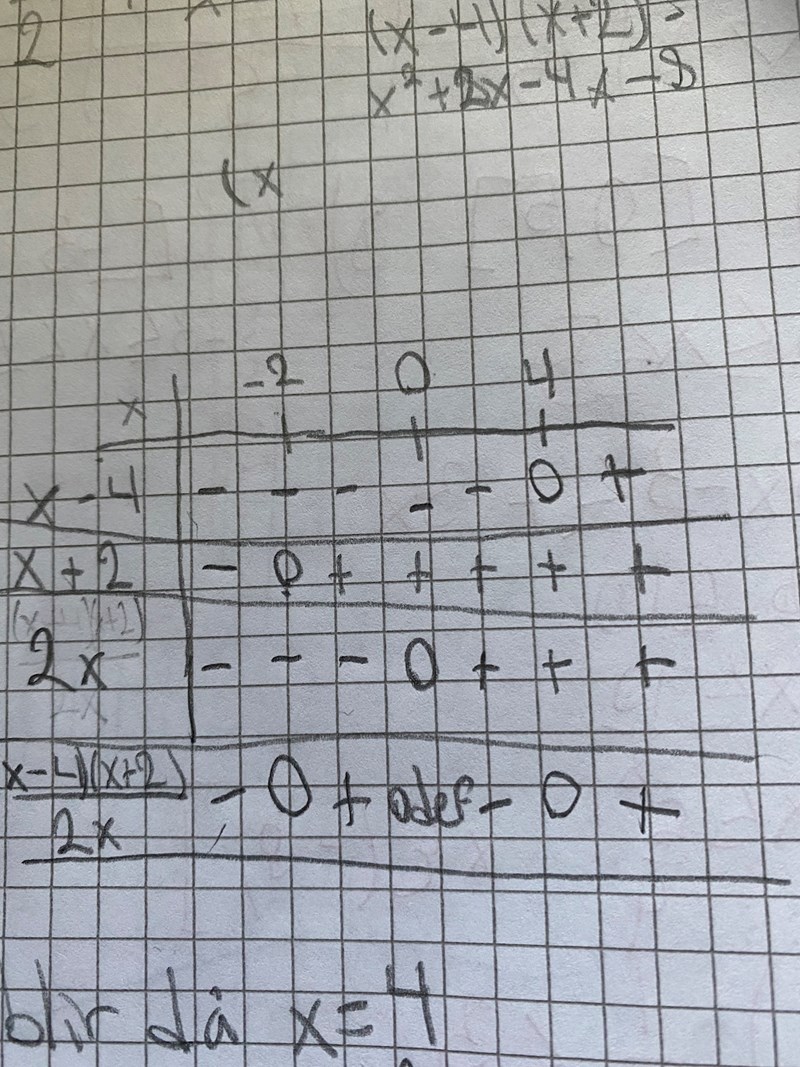 ((x^2)-2x+8)/2x >/ 0 vilket jag i sin tur förenklade till (x-4)(x+2)/2x >/ 0